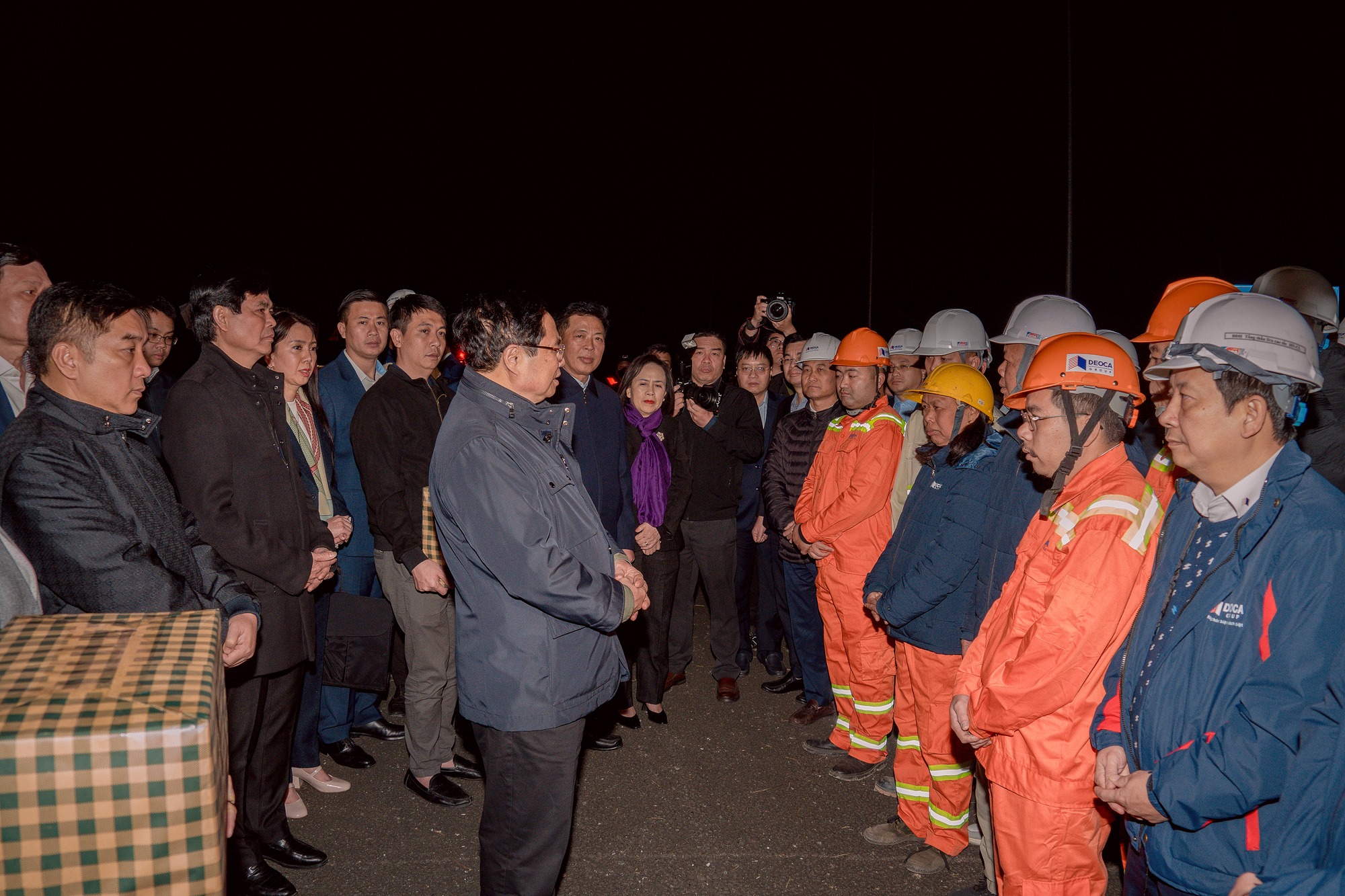 Giữa tiết trời giá rét, Thủ tướng ghi nhận và biểu dương tinh thần nỗ lực của đội ngũ kỹ sư, công nhân ngày đêm bám công trường với phương châm làm việc “xuyên lễ, xuyên Tết”, góp phần hiện thực hóa mục tiêu hoàn thành 3.000 km cao tốc vào năm 2025 và phấn đấu xây dựng 5.000 km cao tốc vào năm 2030.